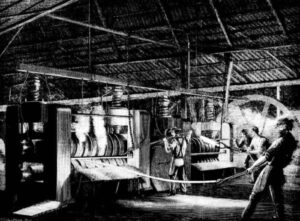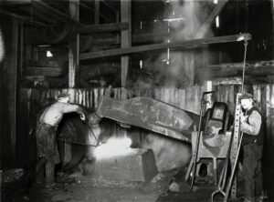 The mills for rolling iron are simply immense tent-like roofs, covering acres of ground, open on every side. Beneath these roofs Deborah looked in on a city of fires, that burned hot and fiercely in the night. Fire in every horrible form: pits of flame waving in the wind; liquid metal-flames writhing in tortuous streams through the sand; wide caldrons filled with boiling fire, over which bent ghastly wretches stirring the strange brewing . . . .5)Davis, Rebecca Harding. 1995. A Rebecca Harding Davis Reader: “Life in the Iron Mills,” Selected Fiction & Essays. Pittsburgh: University of Pittsburgh Press. p. 3