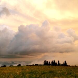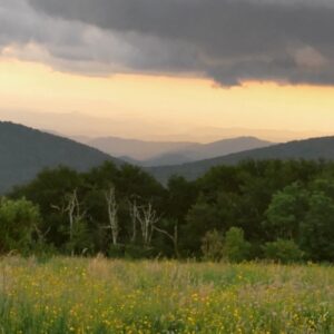 Just past the cross, along a trail through bee balm and black-eyed Susan among the lush meadow grass, Andy and Paul marvel at an all-encompassing view of the Unicoi and beyond. A gentle breeze moves over the two and they both jut their faces toward the mellow current. Within seconds, a slow, serene smile graces their lips, and, just for a moment, Andy thought they might lift up and hover above the earth. Kombu green grasses oscillate among yellow pops of pollinator flowers. Beyond the bald, a spectacle of rain clouds hung like a dramatic curtain, encircles everything. They seep like thick smoke between mountain ridges and rise like waves towards the heavens. Sunlight beams across the bald and between folds in the clouds, adding a palate of color in hues of pink, orange, and gold, contrasting intensely against the darkened sea of rain. The two campers gaze across the horizon with rapt attention, their eyes glazed and mouths slightly open. Their mammal bodies are miniscule in comparison, as if they were mere mortals in a seemingly immortal realm.