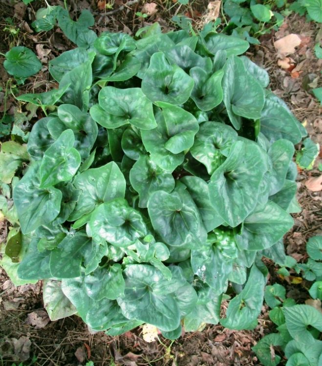 Wild ginger is a member of the Birthwort family. Here, it grows in the eastern United States, and prefers shady places with “rich Mesic soils.” The plant can live through temperatures below 40 degrees.2)Strauch, Betsy. 2018. “Mother Earth Living.” Herb to Know: Wild Ginger. Accessed May 2021. It is a slow-grower, but, once happy and flourishing, spreads by rhizomes just underneath the earth’s surface. The rhizomes branch out and are fairly delicate. The plant is not true ginger (Zingiber officinalis) but does smell the same, albeit less pungent.