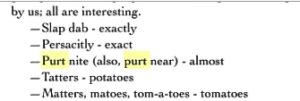 The words “pretty near it” mean “nearly” or “almost.” In an eastern Kentucky dialogue collection from 1911, the speaker says “prettynēart,” meaning “almost”:
