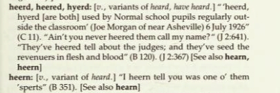 Heerd, heered, hyerd = “[v. variants of heard, have heard] . . . ‘heerd, hyerd [are both] used by . . . school pupils regularly outside the classroom’ (Joe Morgan of near Ashville) 6 July 1926.”