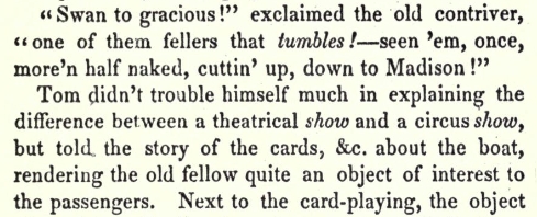 The word “swan” used as a verb means “To swear; to declare . . . to express surprise, indignation, or emphasis . . .” The phrase “I/ I’ll swan” may originate from the Scottish “I’se warn” which means “I’ll warrant,” or “I’ll be bound.” The word “swanny”/ “swanee” means the same thing as “swan,” when it comes to swearing. The usages are considered old-fashioned.11)Dictionary of American Regional English A May 20, 1823, article in the Missouri Intelligencer admitted the word was a more genteel way to swear.