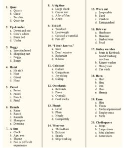 From time to time, Appalachia Bare will produce Appalachian English quizzes (with phonetical spellings) as a fun way to test the reader’s knowledge about our old language. Take a look at our second quiz below (and, if you’d like, take our first quiz as well). Find out the answers on our next post!