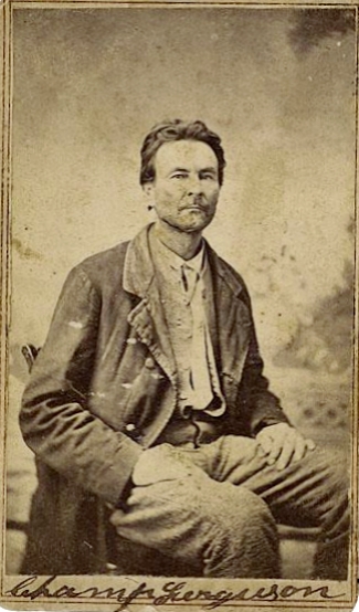 • Champ Ferguson was a notorious Confederate guerilla during the Civil War. He’s alleged to have killed over 100 Yankee soldiers and pro-Union civilians. Born in Clinton County, Kentucky, on the Tennessee border, Ferguson was the oldest of ten children. He earned a reputation for violence even before the Civil War. On August 12, 1858, an altercation would result in a feud between Ferguson and the Evans brothers, Floyd and Alexander. Ferguson repeatedly stabbed to death the Evans’ cousin, James Reed, acting constable of Fentress County, Tennessee.