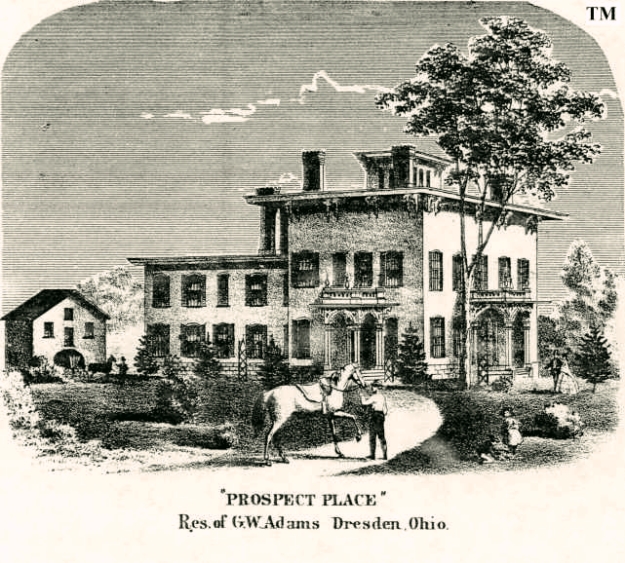 George Willison “G.W.” Adams was an abolitionist from Virginia who emancipated his slaves before he moved to the free state of Ohio. He and his family were highly successful flour mill merchants. During the Civil War, he gave the Union his land for a “right of way to both the Panhandle and the Cincinnati & Muskingum Valley railroad companies,”45)Sutor, J. Hope. 1905. Past and Present of the City of Zanesville and Muskingum County, Ohio. Chicago. thereby providing a supply chain. His home, Prospect Place, was built by paid labor.