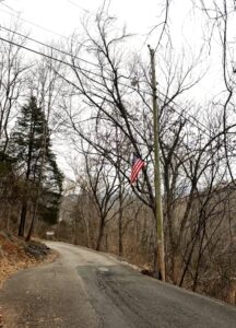 Her house is on the mountain too. We share a gravel road, this steep, twisty one-lane driveway in the woods so we have to drive a big SUV instead of a small car and the school bus wouldn’t even try. The neighborhood mailboxes are side-by-side at the bottom, eight or nine tucked under a little roof with a bird’s nest inside, the mama flapping in your face when you get too close. An American flag sticks out from the utility pole above it, but only halfway up so it doesn’t touch the wires. Half-mast, Grandpa says, like something bad has always just happened.