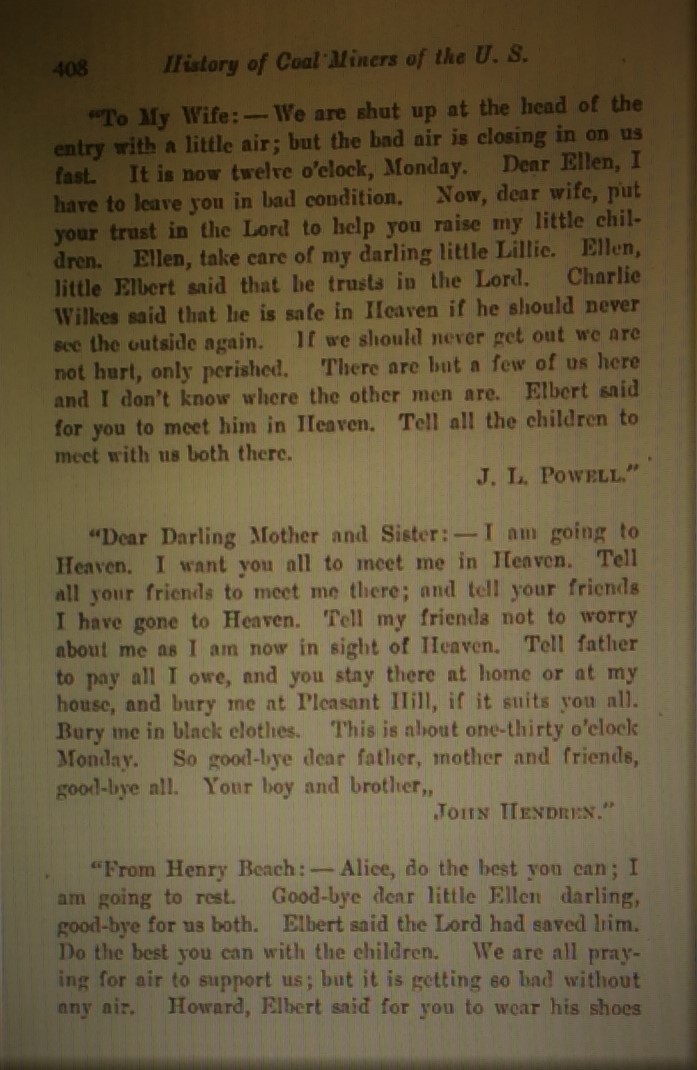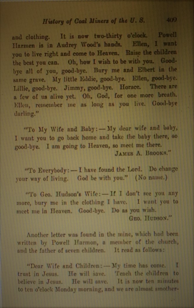 The beginning scene is fictional, of course, but is it? It is the story of every woman whose husbands move down, down, down to the darkened place. For Fraterville, the men were three miles down. Other mines in Appalachia were even deeper and miles across. Let us give pause and think of Fraterville . . . then journey forward in Coal Creek.