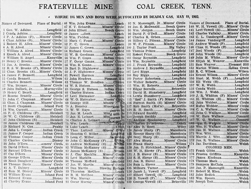 | ↑16 | Offbeat Tennessee. n.d. Fraterville Mine Disaster -largest in TN history, devastated Fraterville with only 3 adult males residents remaining. |