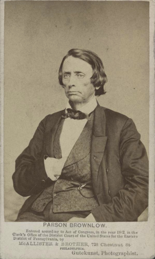 Before William G. “Parson” Brownlow became governor of Tennessee (1865-1869), and U.S. Senator (1869-1875), he was a charismatic preacher who owned a newspaper – the aforementioned Brownlow’s Whig and Rebel Ventilator. As Tennessee came closer to secession, “he became a fanatical Unionist leader.”[14] He “fomented violence toward all Confederate sympathizers and returning Confederate soldiers,” saying the war should be “ ‘pursued with a vim and a vengeance until the rebellion is put down, if it exterminates from God’s green earth every man, woman, and child south of Mason and Dixon’s line.’ ”[15] A diary excerpt from 1864 reads: