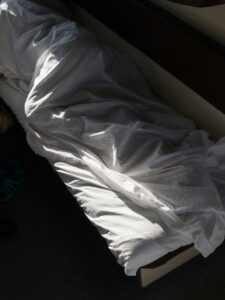 That’s where Randy, Jr lied. They’d had the decency to cover him up. Mom has not (and will never) described the sight to me, but I can imagine the loose white sheet making Randy’s drowned body a faceless mummified death mask. His nose and hands and toes the only visible markers showing he was still human. I wonder if Aunt Ethel Mae ever raised her eyes from her supplications to watch for the sheets to move, for the white death mask to tremor again with the breath of God.