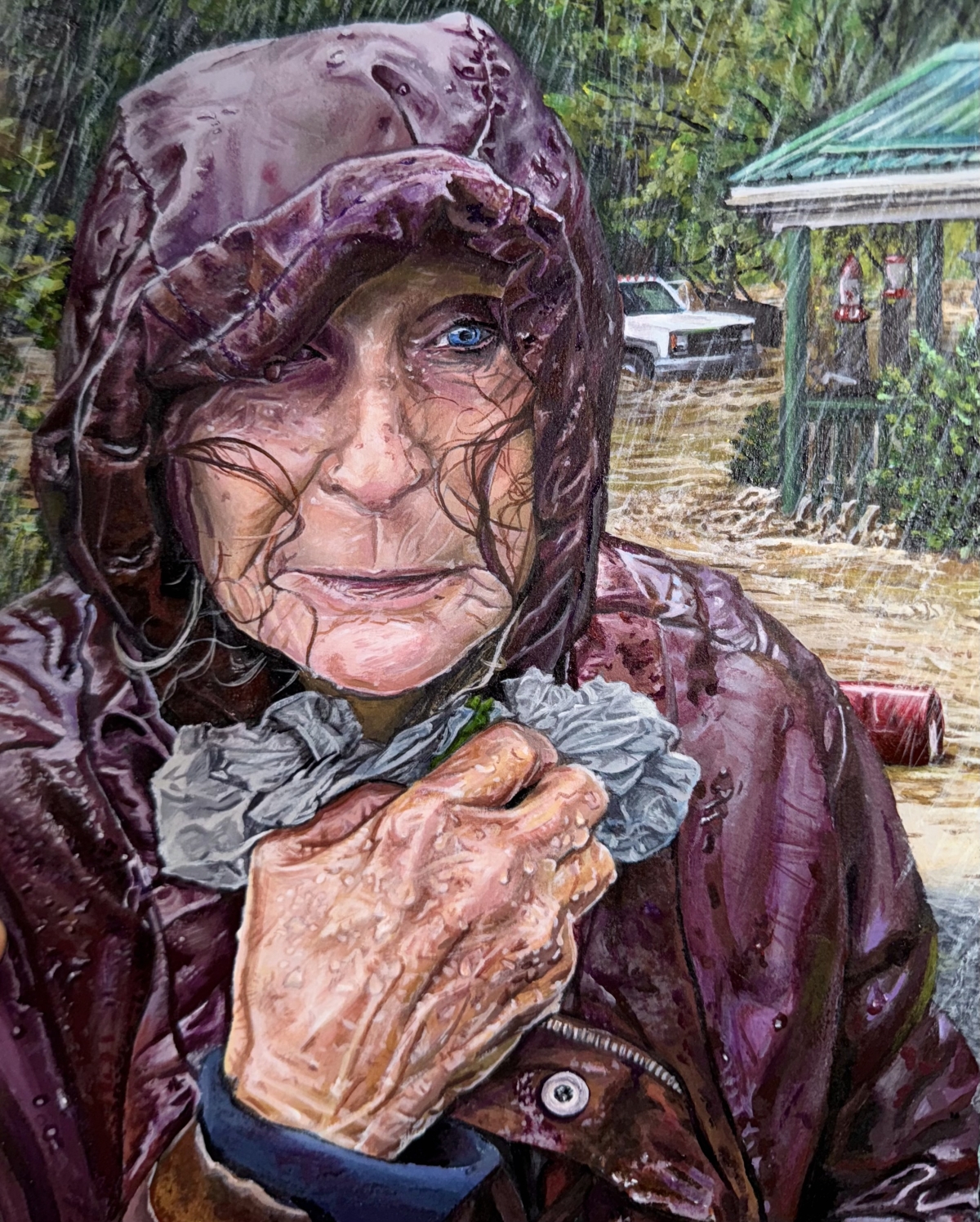 September 27th, 2024, is a date that everyone in Western North Carolina has imprinted on their hearts forever. The helplessness we all felt during Hurricane Helene is depicted within the portrait of my Mamaw Clare, one of the toughest women alive. As the creek got higher and higher, we couldn’t do anything but watch. My goal with this painting was to express the collective heartbreak felt within my community, hopefully giving the viewer a face to statistics they may have read.