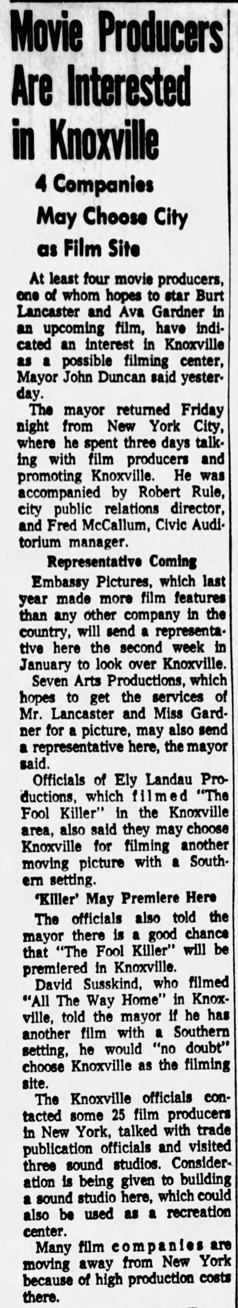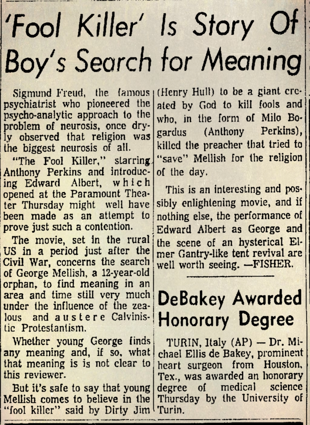 Almost a decade after its publication, The Fool Killer attracted the attention of Hollywood when renowned Mexican filmmaker Servando González directed a film adaptation of the novel, starring Anthony Perkins (of earlier Psycho fame) and a young Edward Albert. Of particular interest to film aficionados may be that most of the scenes were shot in and around Knoxville. The world premier of the movie took place in the city at the Tennessee Theater on April 28, 1965.