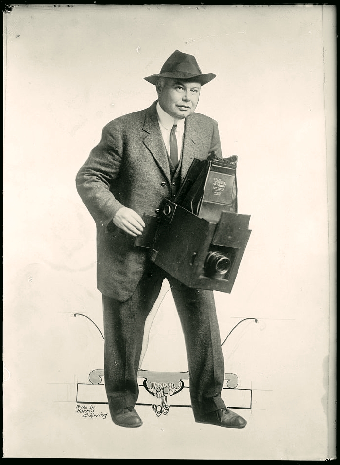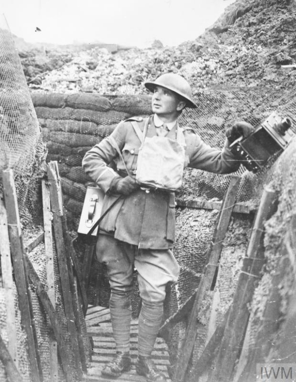 PHOTOGRAPHY DURING THE FIRST WORLD WAR (Q 24087) Ernest Brooks, the first British official photographer to be appointed, seen in a trench on the Western Front. He is carrying a Goerz Anschutz plate camera. Brooks served as a photographer on the Western Front from March to 1916 to early 1919. He also covered the Dardanelles Campaign in 1915, the Italian Front and naval subjects. After the war he returned to press photography. Copyright: © IWM. Original Source: http://www.iwm.org.uk/collections/item/object/205125177