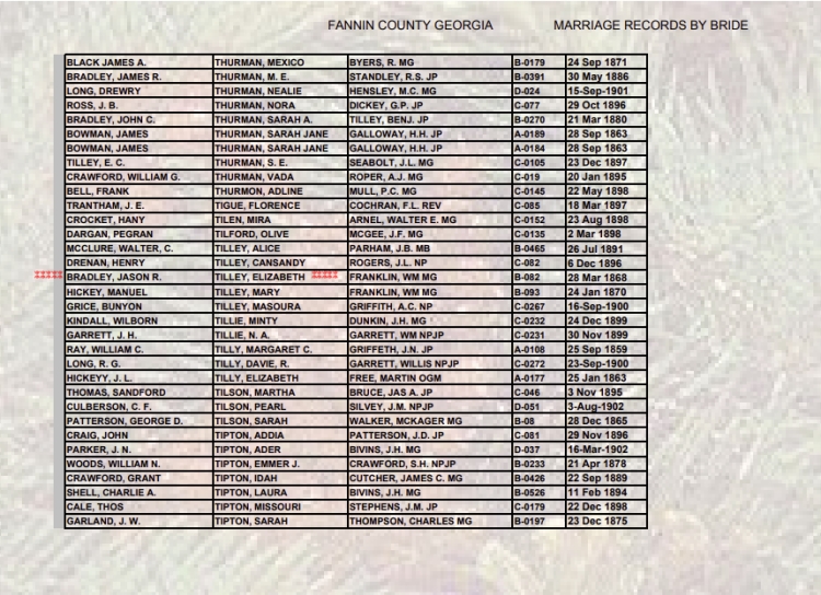 The Tilley family and the Stanley family were feuding. They rubbed each other raw until everything came to a head. One Sunday, some Stanleys gathered together, rode by Tilley Bend Church during services, and shot into the building. The minister was killed, along with a number of parishioners. Among the dead was the daughter of Elizabeth Jane Tilley Bradley, a granny woman who was part Creek Native American. She and her husband, Jason Riley Bradley had eight children: six girls, two boys.23)Hampton, Shane. 2017. “Is This Graveyard and Church Haunted? The Tale of Tilley Bend.” Wanderluster. Sept 28.