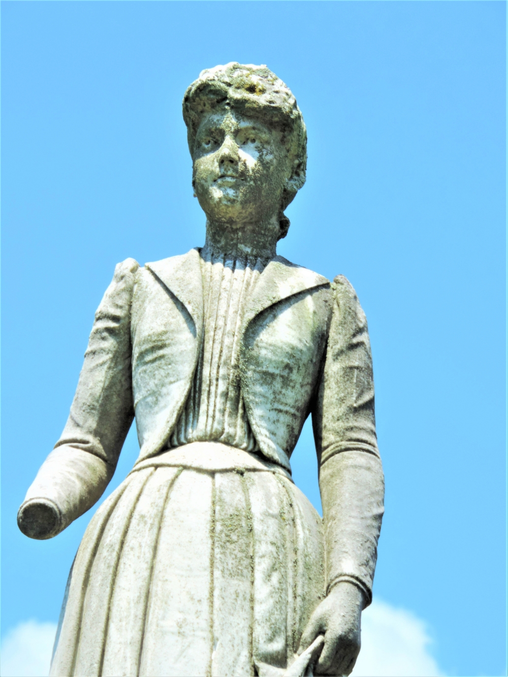 The most unique tombstone known in this section was shipped from this city. It is a statue of the late Mrs. James Hatcher, the deceased wife of a Pikeville, Ky., banker. It is in marble and is the exact hight [sic] of the deceased and is a perfect likeness of her, a cabinet photograph having been used as a model. In the right hand is a parasol, the handle having an immense ring. Even the fashion of the dress is copied.43)Rubio, J’aime. 2015. “The True Story of Octavia Hatcher – History vs. Myth.” Dreaming Casually. Jan 13.