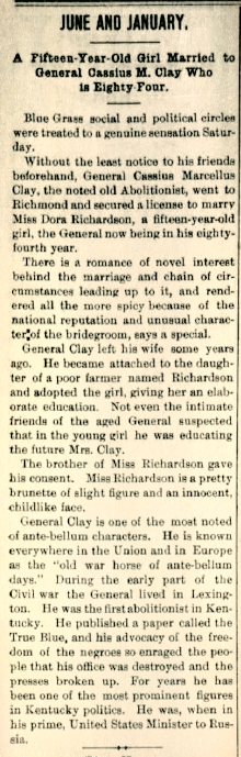 Cassius and Mary Jane had ten children. Unfortunately, they divorced in 187862)Davis, Linda. 2000. “Cassius Marcellus Clay.” Find-a-Grave. Jan 6. after 45 years of marriage, likely because of Clay’s philandering. He shocked the nation when he married child bride Dora Richardson in 1894.63)Davis, Linda. 2000. “Cassius Marcellus Clay.” Find-a-Grave. Jan 6. She was fifteen and he was eighty-four. They divorced after four years.64)A Grave Interest. 2011. “White Hall and Cassius Marcellus Clay.” A Grave Interest. Oct 14.