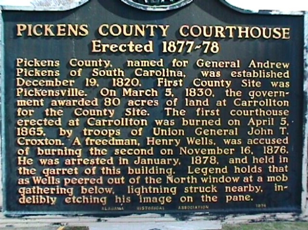 Henry Wells was an African American freed slave accused (along with his friend, Bill Burkhalter) of burning down the Pickens County Courthouse in 1876. Why he was accused of doing so is debatable. According to Michael Norman and Beth Scott, authors of Haunted America, Carrolton historian Dan Turnispeed stated that Henry Wells was “accused of raping a white woman” and “was allegedly told that if he burned the courthouse all the records of his arrest would be destroyed . . .” However, the February 6, 1878 edition of the newspaper West Alabamian states that Wells wrote his confession, saying Burkhalter, who’d been in trouble with the law before for burglary, persuaded him to break into the courthouse and steal money. Strange thing is, Wells could neither read nor write. So, the “confession” validity is questionable. He even signed the confession with an X.21)Norman, Michael and Beth Scott. 1994. Haunted America. New York: Tom Doherty Associates.