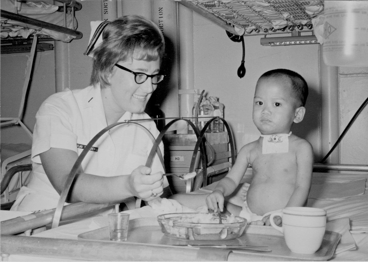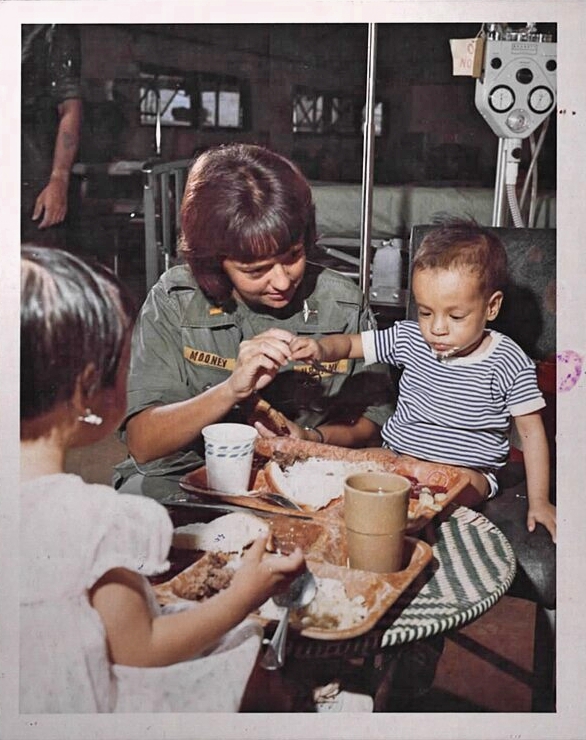We stopped in the pediatric unit full of Vietnamese children injured by the war. What shocked me most was the size of the children and young adolescent patients. So many were so tiny and so sad-looking. Maybe this is how it would have looked if all the American children in a pediatrics unit had been in bad car accidents. Their bodies were wrapped in gigantic bandages. Often their arms and legs were in casts or splints. Their huge, serious, solemn eyes peered from their undernourished faces. I remember thinking, These are children. They had no place in a war zone. Standing there looking at the children, my heart melted, and all I wanted to do was stay. But Colonel Skodova was getting anxious for us to move along.