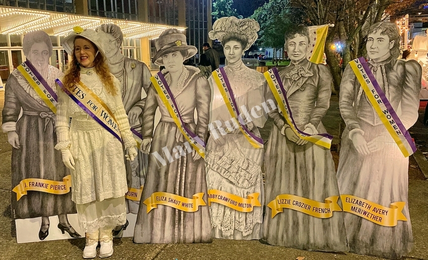 In the parade, the carrying of the life size ladies brings them into our present-day world. It is like we are marching alongside of them. The crowd enjoys seeing us and especially enjoys seeing them. — Mary Ruden