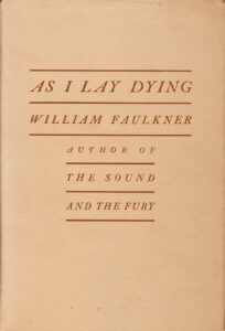 Faulkner’s As I Lay Dying is a dark comedy, grotesquely so. The book lacks a conventional plot; instead, the novel is narrated by fifteen characters over fifty-nine chapters. Hence, the reader is the unifying consciousness tasked with discovering a complete story from the sum of its disparate voices. The narrative is about the death of Addie Bundren and her poor rural family’s quest to honor her wish to be buried several hundred miles away in her hometown of Jefferson, Mississippi. The arduous nature of the journey shows the extent of Addie’s contempt for her family and her desire to punish them. (One critic notes that the name Bundren is an anagram of burden.)