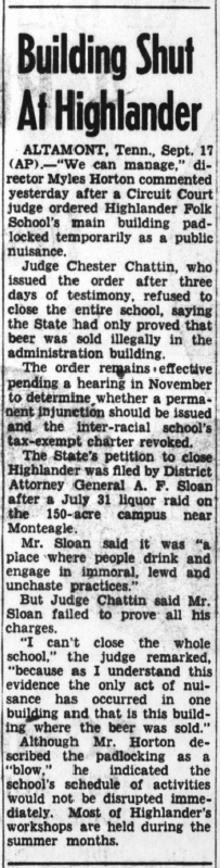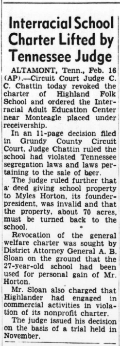 For years suspicions that Highlander was a “Communist training school” dogged the center until, in 1961, the state of Tennessee revoked Highlander’s charter, confiscating its land and buildings. The next day, Myles Horton reopened the school as the Highlander Research and Education Center. From 1961 to 1971, it was based in Knoxville; in 1972, it moved to its present location in New Market, Tennessee.