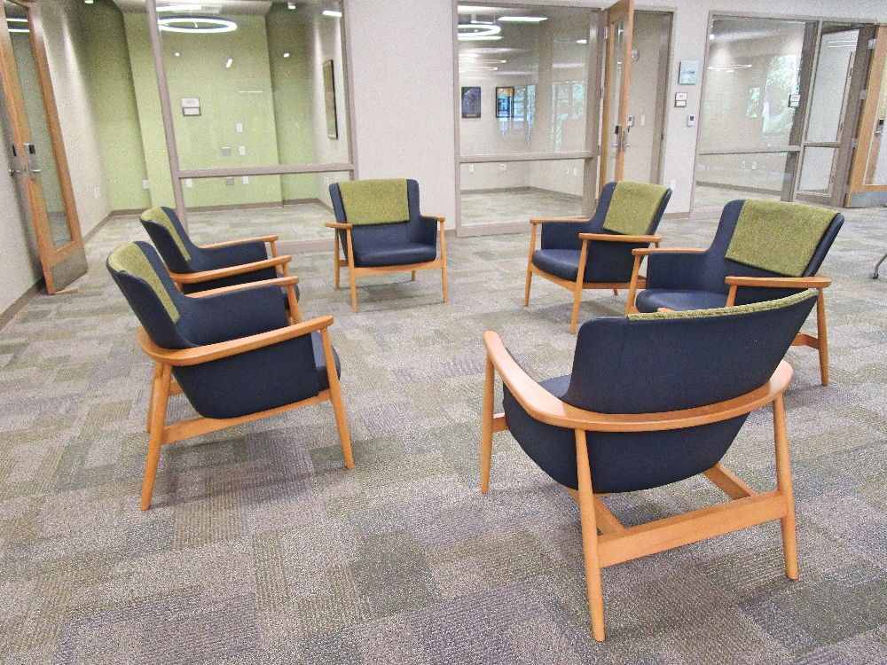 The area was “designed by Community Tectonics and built by Evans-Ailey Construction.” Every inch of the library was meticulously planned, incorporating an overall theme of Appalachia’s natural world. Chairs have a simple, modern design employing two colors – a blue that symbolizes Appalachia’s baby blue skies and deep blue lakes, and a green that signifies our numerous tree species or grassy flora. Carpeted areas have patch-colors comprised of slate-grey, speckled brown, and muted green. The wood element is smooth throughout. The walls are designed in slight notches, hearkening back to old log cabins.