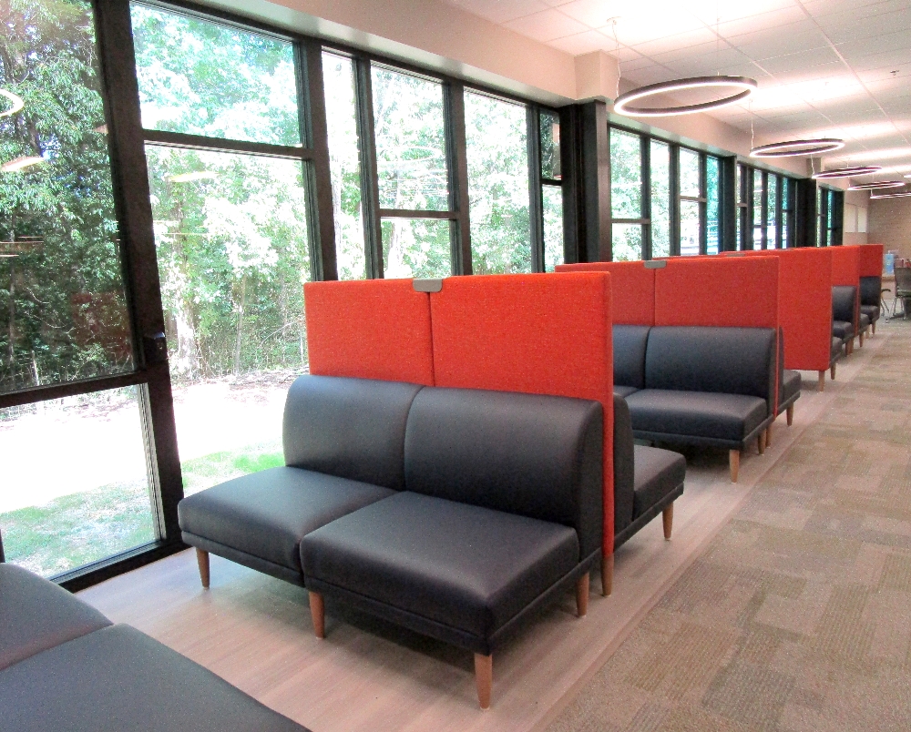 The eye is drawn to the corner of the room where a gorgeous hearth-like area, reminiscent of settler days, rests atop natural stone flooring that reminds one of our river rock and mountain slate. To the left of this rustic area, booths are positioned in a long row beside floor-to-ceiling windows. Images come to mind of bygone passenger trains (the difference, of course, being these are stationary and equipped with plugs and USB ports) or perhaps the inference is that we should travel forward together. Not only do the large windows provide natural light to the room, they also offer a visual reminder of nature.