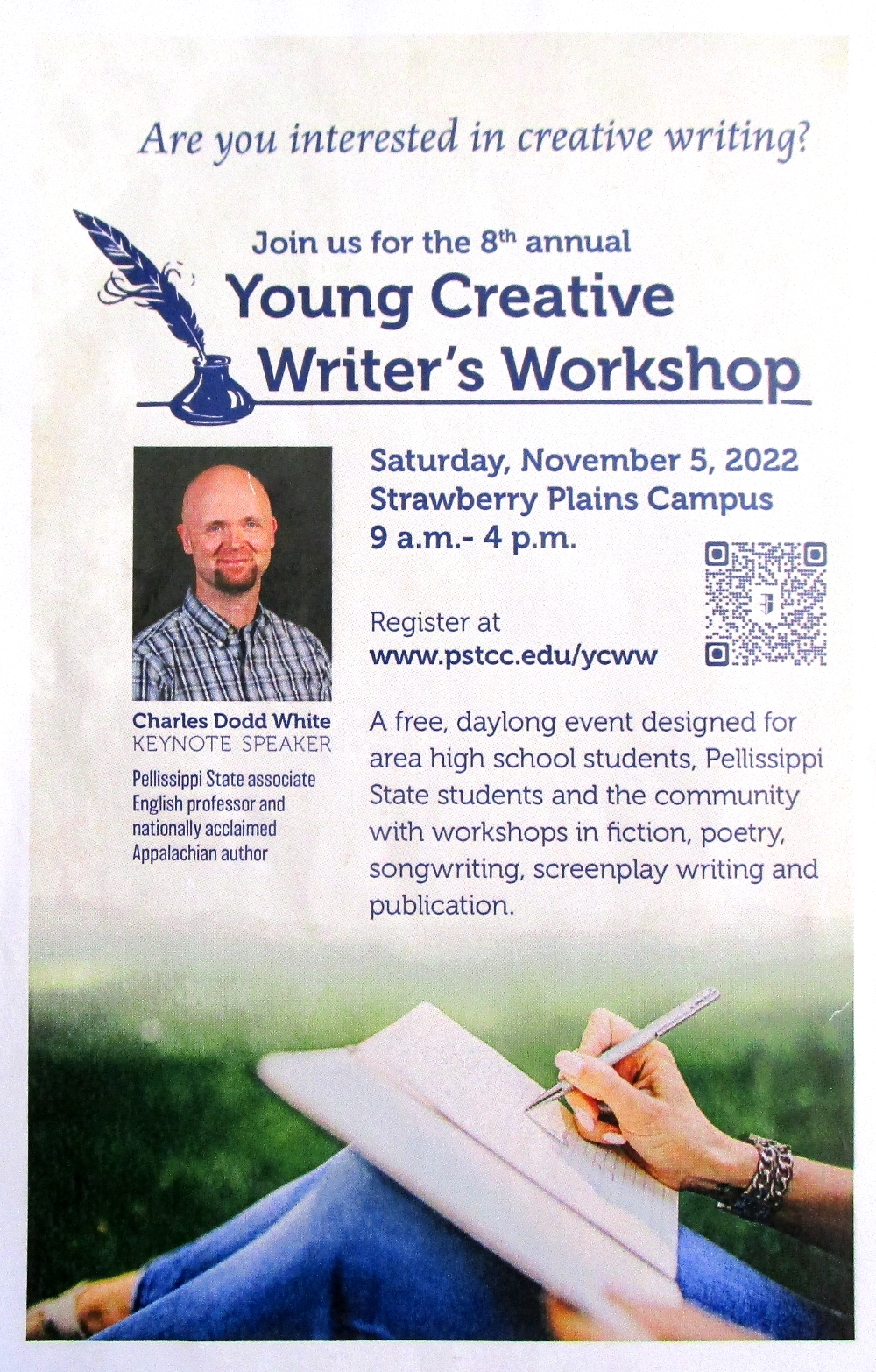 An upcoming event at Pellissippi’s Strawberry Plains Campus is the Young Creative Writer’s Workshop. The event is Saturday, November 5, 2022 from 9:00 a.m. to 4:00 p.m. and is free to the public. Workshops will feature fiction, poetry, songwriting, screenplay writing, and publication. The keynote speaker is Charles Dodd White. Enjoy these images from the last Workshop, along with information about this year’s event.