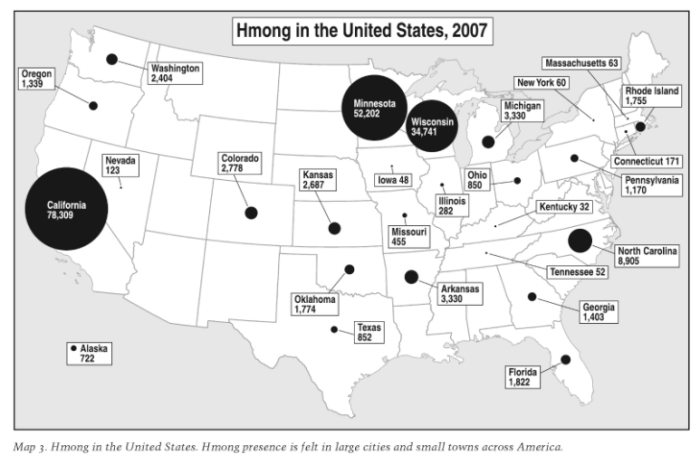 The U.S. resettlement strategy was not terribly successful. The Hmong, ever the independent and self-sustaining people, had no desire to be farmworkers for a “corporate agricultural system” and they preferred to be together within their own “clan.” The population shifted toward the Midwest and the South in the 1990s. Today, they are considered one of “the fastest growing Asian group[s]” in the nation.27)University of North Carolina, Greensboro. n.d. “Hmong Students and UNCG.” UNC Greensboro. Accessed May 2021.