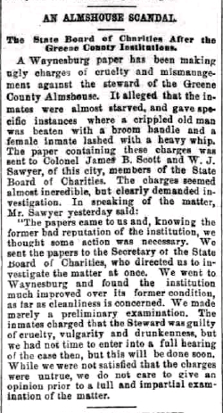 The Greene County Poorhouse saw a series of directors and stewards come and go. Most all these men and their families were kind and compassionate. But, as we all know, a rotten potato makes the whole bag stink. William B. Cage became the poorhouse director (not sure about the exact date of his hiring). Cage was a rotten potato. Sources say he was heartless and “sadistic.”14)Asylum Projects. Updated 2020. “Greene County Almshouse.” Asylum Projects. June 30. Newspapers at the time published articles regarding Cage’s inhumane treatment. The website Asylum Projects quotes an 1890 article in The Waynesburg Republican: