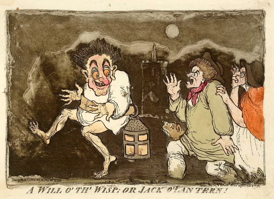 Another theory about the term Jack-o’-lantern has something to do with the glow that lights up the goul’s face. Some have associated the word with the “will-o’-the-wisp,” a strange, ethereal light that glows within dark wooded areas or heavily mired swamps. The light is called ignis fatuus, meaning “foolish fire” or “false fire,” and is described as “flame-like.” The phenomenon occurs when gases rise from decomposing plants. The firelight was once believed to be a mythical Siren that would “lead people astray or lure them with its evil ways.”4)“How Did the Jack-O’-Lantern Become a Scary Halloween Staple? Learn the History Behind These Carved Pumpkins: excerpt From the Book Pumpkin: The Curious History of An American Icon” by Parade August 17, 2023. Book by Cindy Ott.