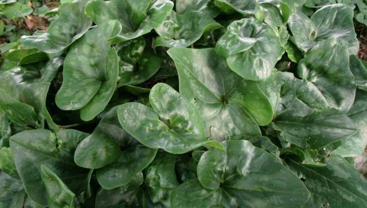 Wild ginger is a member of the Birthwort family. Here, it grows in the eastern United States, and prefers shady places with “rich Mesic soils.” The plant can live through temperatures below 40 degrees.2)Strauch, Betsy. 2018. “Mother Earth Living.” Herb to Know: Wild Ginger. Accessed May 2021. It is a slow-grower, but, once happy and flourishing, spreads by rhizomes just underneath the earth’s surface. The rhizomes branch out and are fairly delicate. The plant is not true ginger (Zingiber officinalis) but does smell the same, albeit less pungent.